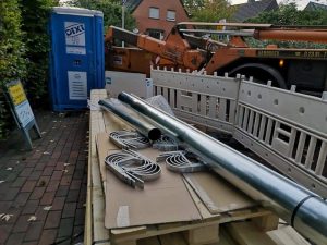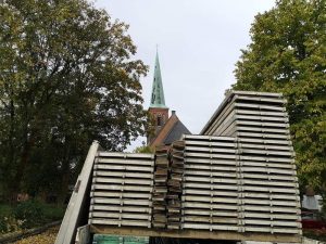 Der Grund dieser temporären Dunkelheit war ein großer Lastwagen. Er hatte die Dachpfannen an Bord. Sie stehen nun palettenweise am Brunnen und warten auf das Eindecken.