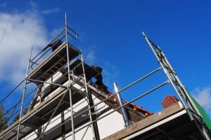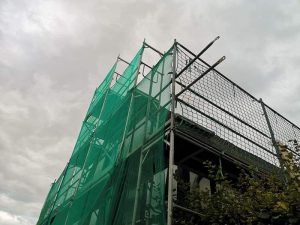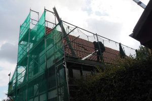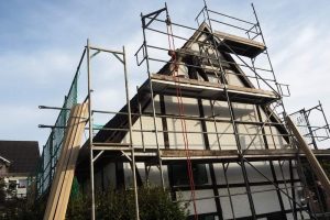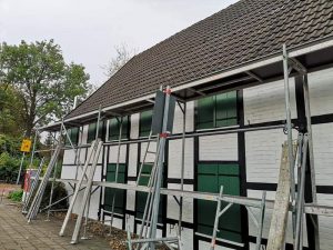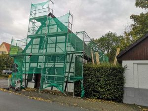 Durch das Gerüst an „Reumkes FachWerk“ lassen sich unsere Blendläden nur noch spaltweise öffnen. Es ist wie in Italien bei hohen Außentemperaturen; dann sind die Fenster plus Blendläden zu. Nur, wir sind „ausnahmsweise“ in Bockum-Hövel und unser denkmalgeschütztes Häuschen soll ein neues Dach bekommen.