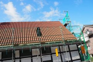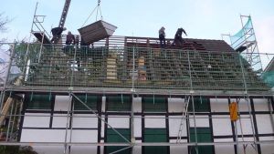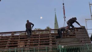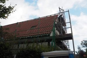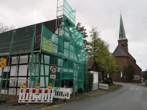Dank der fach- und sachkundigen Dachdeckerperformance! Martin Wolf hat die Dachpfannenaufführung fotografisch begleitet. Einfach spannend! Schon jetzt sind wir von dem täglichen Anblick angetan. Christiane und ich freuen uns jetzt schon auf den Tag, an dem die Gerüsthüllen fallen. Dem Höveler Dorf wird das schöne Erscheinungsbild bestimmt gefallen.