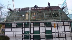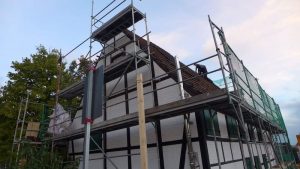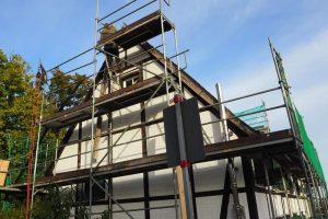 Bearbeitet wurden Teile des Gefaches, eines der beiden Giebel mit Anstreichen und Ausbessern der Fassade, das Auswechseln und streichen der Windbretter und vor allem das komplette Decken des Daches.