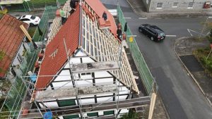 Alles ist bereit! Die fach-und denkmalgerechte Dach-Sanierung von Reumkes Fachwerk, einem „Arme Leute Häuschen“ aus dem 18. Jh. kann starten. Wichtiger Mitarbeiter dabei ist der Wetter-Gott. Drückt uns die Daumen.