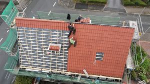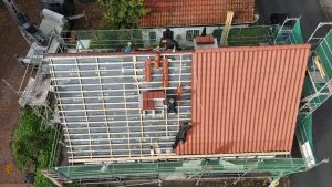Heute Morgen wurde es ernst. Die Mitarbeiter des einheimischen Dachdeckerfachbetriebs Martin Wolf rückten pünktlich um 07.00 Uhr an. Seit dem herrscht hier Hochbetrieb. Die alten Dachpfannen, gedeckt im Jahre 1961, waren bereits um 10.00 Uhr Geschichte. Seit dem wird der Dachstuhl foliert. Das ist gut gegen Regen und sorgt für zusätzliche Isolierung. Gleich sollen die ersten neuen Pfanen ihre Bleibe auf unserem „Arme Leute Haus“ aus der Mitte des 18. Jahrhunderts finden, denkmalgerecht natürlich. Für mich persönlich ist diese Dachdeckerei eine echte Premiere. Ich bin gespannt, wie unser Häuschen danach wirkt.