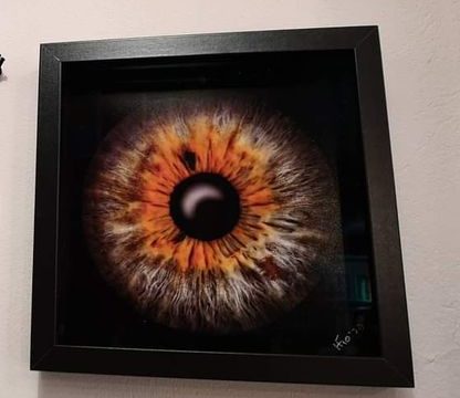 Direkt links neben meiner Schulter hängt ein Foto, gemacht von Heinz Feußner und zeigt das Auge von Christiane mit all den fröhlichen, optimistischen, emotionalen, menschlichen, positiven, ermutigenden Facetten, die ein menschliches Auge ausmacht.
